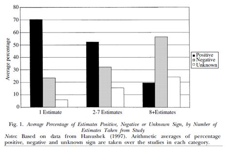 “For the 17 studies from which Hanushek took only one estimate, for example, over 70% of the estimates indicate that students tend to perform better in smaller classes, and only 23% indicate a negative effect. By contrast, for the nine studies from which he took a total of 123 estimates the opposite pattern holds: small classes are associated with lower performance.”